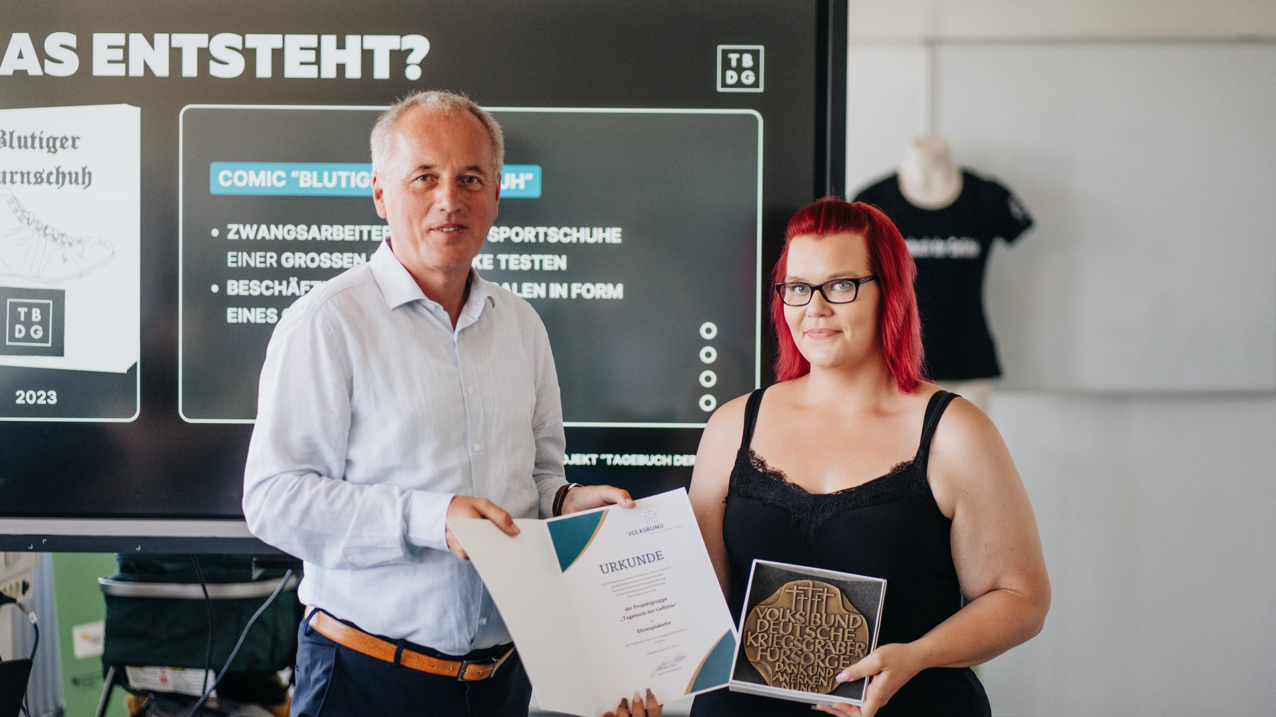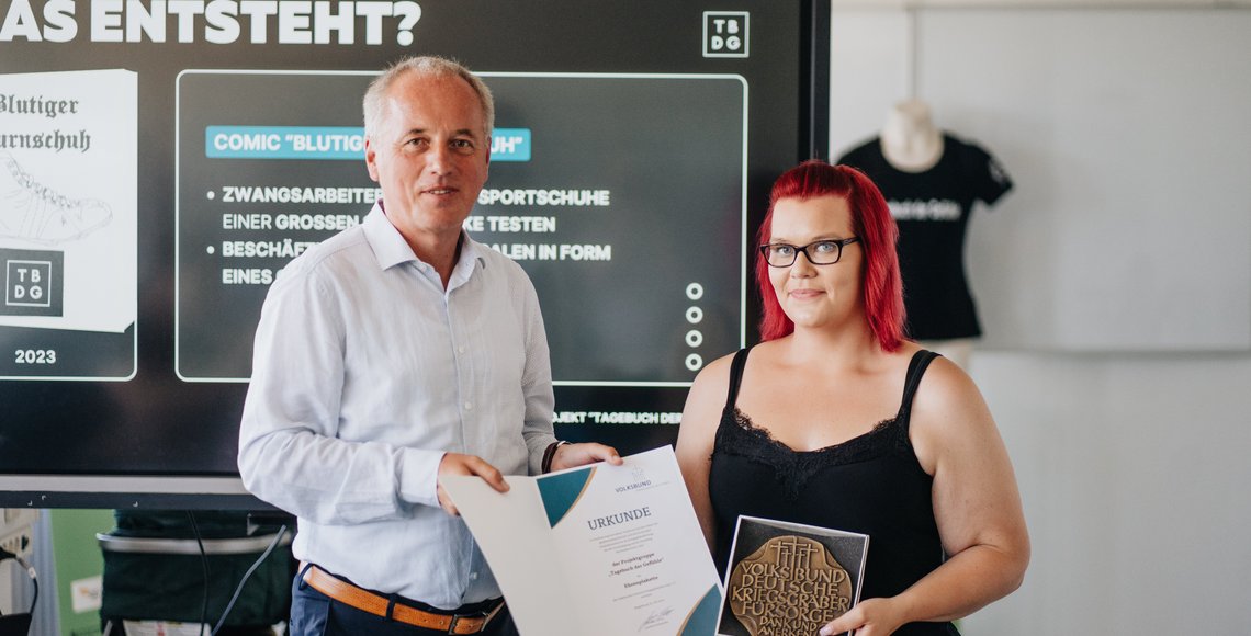 Anfang der Woche zeichnete Rüdiger Erben in seiner Funktion als Landesvorsitzender des Landesverbandes Sachsen-Anhalt die Gruppe um das Projekt "Tagebuch der Gefühle“ aus. Die Gruppe aus Halle (Saale), die sich über die vergangenen Jahre bereits in vielen Bereichen engagiert hatte, reichte in diesem Jahr einen Comic unter der Thematik „Blutiger Turnschuh“ ein, welcher in einem vom Volksbund Deutsche Kriegsgräberfürsorge ausgeschriebenen internationalen Gruppen-Wettbewerb den 1. Platz belegte.