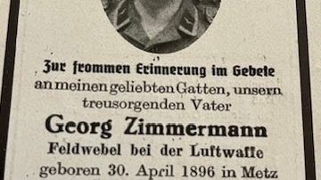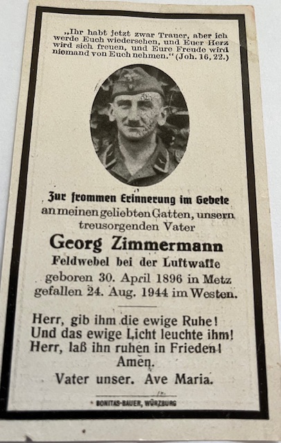Großvater Georg Zimmermann in Metz/Frankreich geboren musste im 2. Weltkrieg im Jahr 1939 für Deutschland abermals in den Krieg ziehen, nachdem er schon 1914-1918 beim 1. Weltkrieg in den Krieg gezogen war. Er war stationiert bei der Luftwaffe und kämpfte bis zu seinem Tod im Süden von Frankreich.